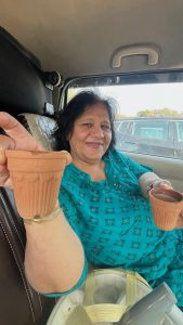 In India, larger metal teapots, known as Chai kettles, were used to infuse tea and spices. From these many small terracotta Kulhad cups were filled. These vessels were handmade by skilled potters who could produce 20-30 cups an hour. When the trains were introduced to India, travellers were served Chai in returnable glass cups. I have memories of this from childhood trips to visit family in India.