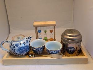 Porcelain Tea Set Gift Box – A traditional blue & white teapot with two matching cups, presented with a wooden serving tray, sand timer, measuring spoon and a small gold caddie containing your choice of Holy Cow tea blend for £51.