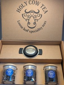 Sample Jar Selection – your choice of three tea Holy Cow tea blends presented in small, wooden lid glass jars with an infuser for easy brewing for £32.