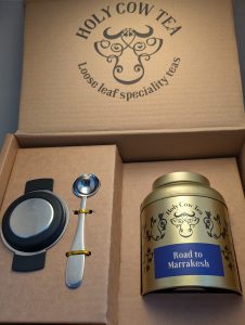Glass Teapot Gift Box – A glass teapot is the perfect way to appreciate the colour of our bespoke blends. This set features a wooden serving tray, sand timer, measuring spoon and a small, gold caddie containing your choice of Holy Cow tea blend for £45.