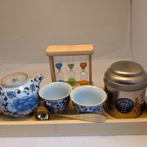 A tea lover's treat. This gift set includes one porcelain blue and white teapot for one, two matching teacups, one perfect-cup-of-tea spoon, one 1/3/5 minute sand timer, one bamboo tray, and your choice of Holy Cow Tea bespoke blend