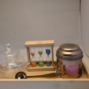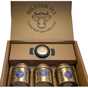A tea lover’s treat. This gift set includes one glass teapot for one, one perfect-cup-of-tea spoon, one 1/3/5 minute sand timer, one bamboo tray, and your choice of a Holy Cow Tea bespoke blend.