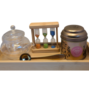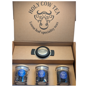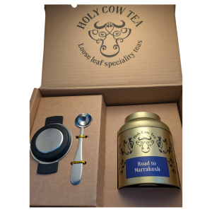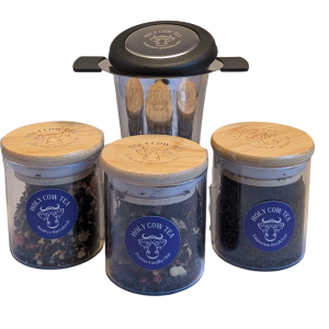 A tea lover’s treat. This gift set includes one glass teapot for one, one perfect-cup-of-tea spoon, one 1/3/5 minute sand timer, one bamboo tray, and your choice of a Holy Cow Tea bespoke blend.