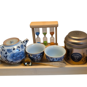 A tea lover's treat. This gift set includes one porcelain blue and white teapot for one, two matching teacups, one perfect-cup-of-tea spoon, one 1/3/5 minute sand timer, one bamboo tray, and your choice of Holy Cow Tea bespoke blend