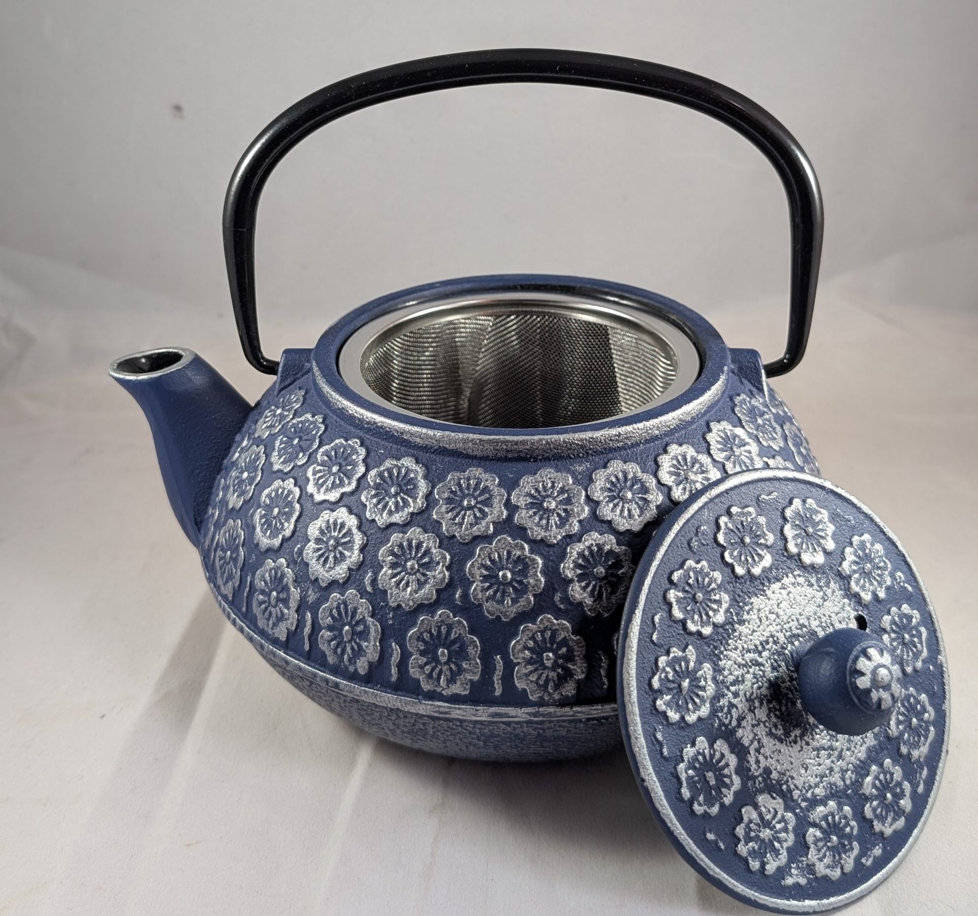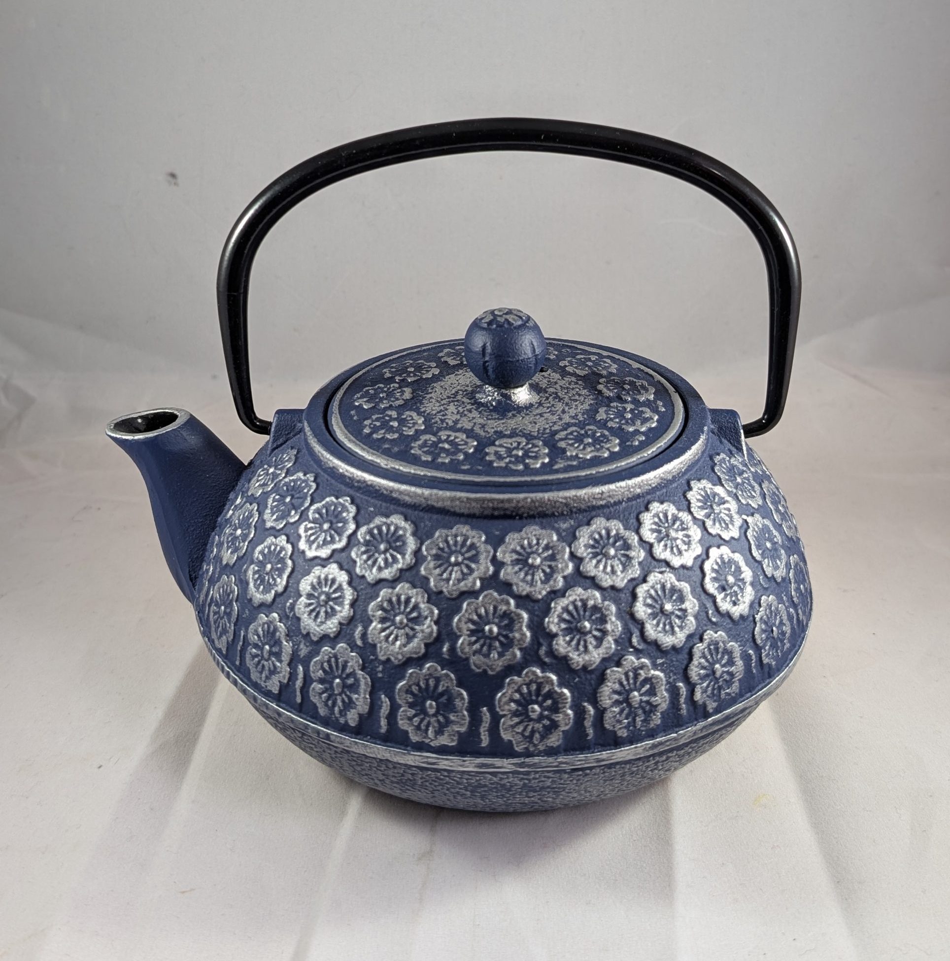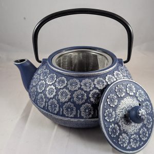 Blue primula cast iron teapot 1 litre with removable infuser basket
