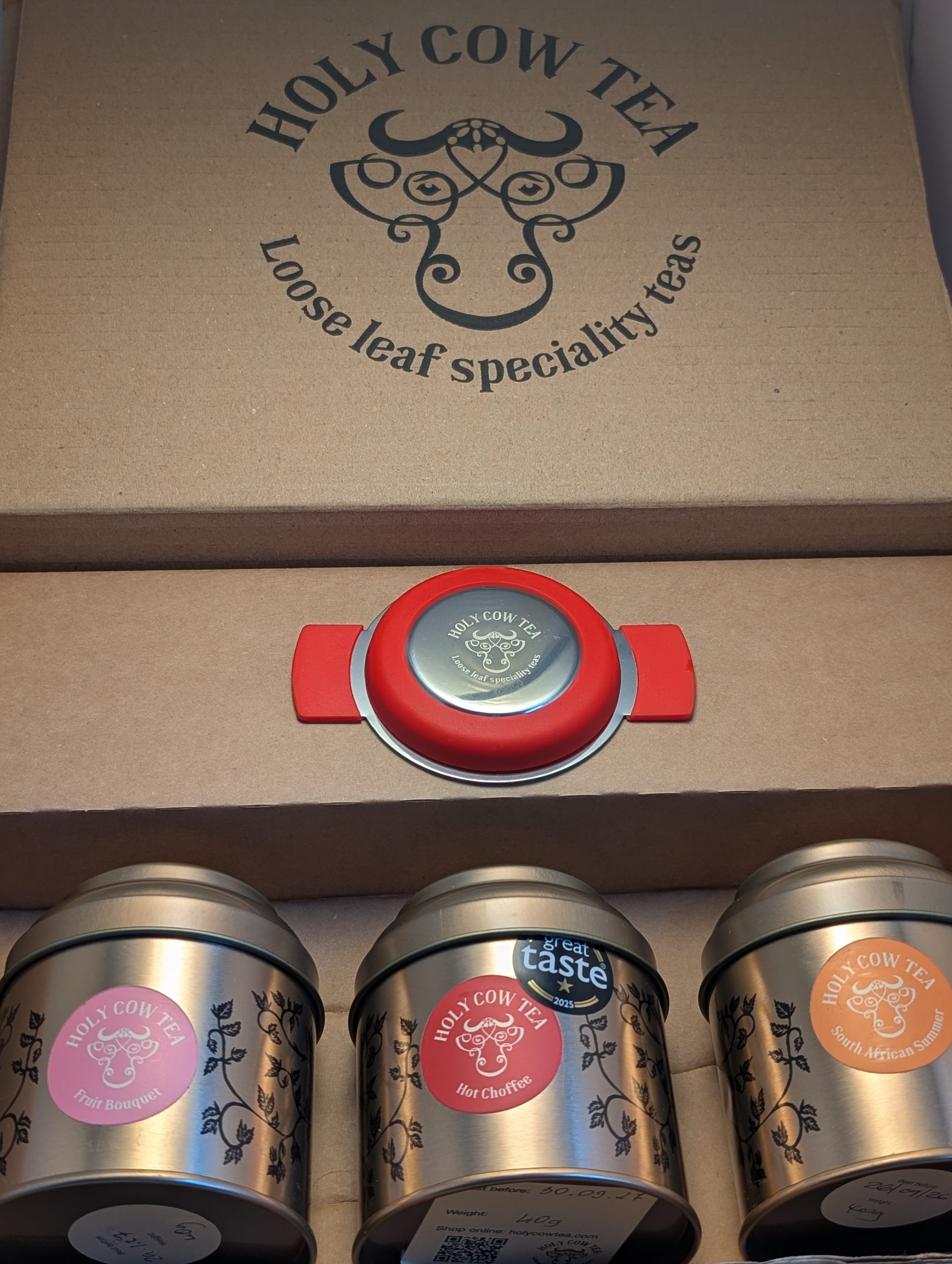- One Holy Cow Tea Infuser Basket – complete with heat-protected handle and lid for effortless brewing.